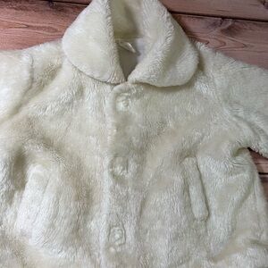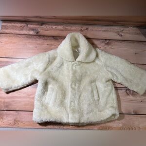 This chic cream faux-fur coat is perfect for keeping your child warm and stylish. Ideal for chilly days. Velcro shut. Good condition. A8