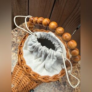 •Drawstring closure | Gold crossbody strap | 20” measured around whole bag