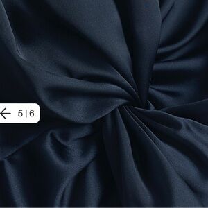 Elegant navy satin blouse. Features a stylish twist front. Short sleeves and collared neckline.