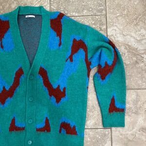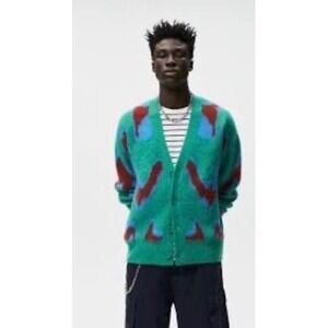 Zara Mens Abstract Jacquard Knit Cardigan Teal Blue Burgundy L-XL