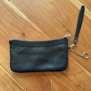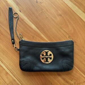 Tory Burch Black Leather Wristlet w/ Gold Logo | Classic Zip Pouch