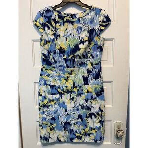 AGB Blue Yellow Floral Sheath Dress Cap Sleeve Midi Stretch Twill Size 14