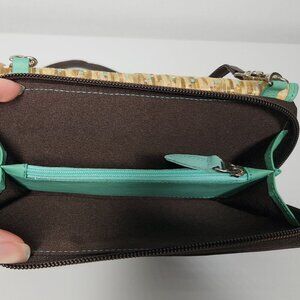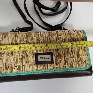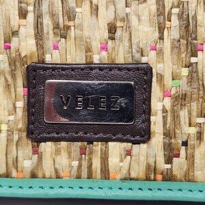 This accessory features a woven straw-like front panel with subtle pops of color, framed by a vibrant aqua green leather trim. The brand's logo, "VÉLEZ," is showcased on a polished metal plaque over a dark leather patch.