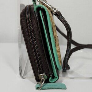 The body and back of the wallet are made of smooth dark brown leather. It includes a detachable brown leather strap with fine stitching, although there is some visible wear on it as shown on the photo, indicating previous use, a compact, dual-compartment design, a front flap pocket and a zippered section.