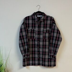 - Chic plaid shirt with button-up design. Features black and pink tones. Ideal for casual outings. Also can be wear as shacket