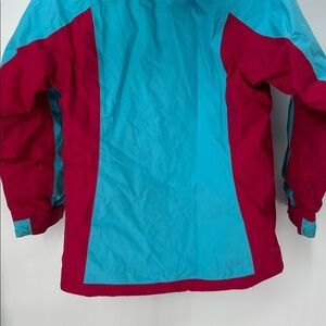 Vibrant Patagonia jacket with teal and burgundy design. Ideal for outdoor activities.