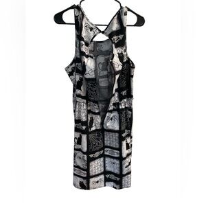 unique gothic swing dress featuring an all-over black and white patchwork print with cats, bats, spiders, webs, and ornate Victorian-style motifs. Perfect for Halloween, spooky season, or everyday alternative wear.