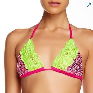 - Triangle top - Halter straps - Back tie closure - Front lace and sequin detail - Made in USA