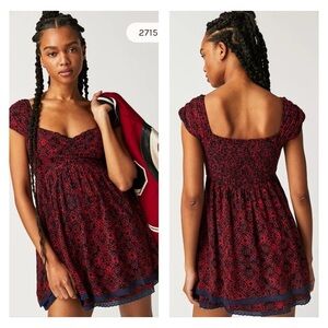 Free People small Tabitha Red Mini Dress smocking babydoll pockets
