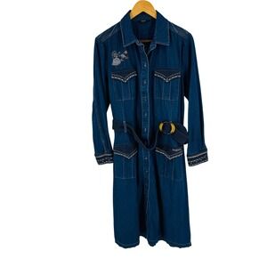 Desigual Denim Shirt Dress Embroidered Studded Belted Midi Western Size 44 Artsy