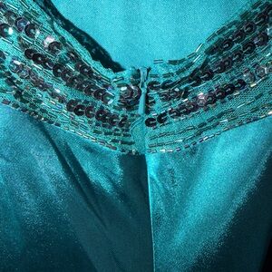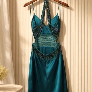 Stunning emerald/teal evening gown by Betsy & Adam in a women’s size 4. This elegant halter-style formal dress features a beautifully ruched bodice with intricate beaded detailing at the waist and neckline. The flowing A-line skirt creates a flattering, timeless silhouette perfect for prom, weddings, galas, or black-tie events.