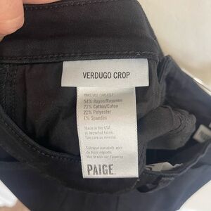 These are black skinny jeans from Paige, featuring a classic five-pocket design. They are made from a soft, stretchy fabric for a comfortable fit. Verdugo Crop, Size 28, Like new condition.