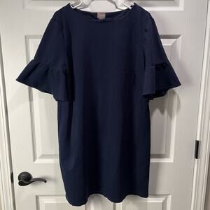Chicos Shirt Dress Women's 3 (XL) Dark Blue Short Ruffle Sleeves Stretch Knee Length