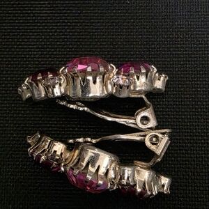 This vintage Weiss jewelry set features pinks & clear rhinestone dome brooch and climber clip on earrings. The set includes a matching pair of earrings and a brooch, making it a versatile and classic addition to any jewelry collection. The vintage nature of the pieces adds a touch of nostalgia and charm to the overall design, perfect for those who appreciate timeless elegance and unique style.