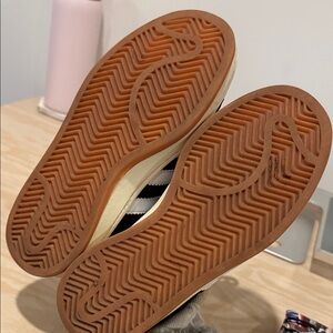 Classic Adidas Campus sneakers in black suede. Features iconic white stripes and durable sole.
