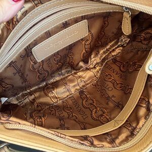 The exterior offers excellent organization with a zipper pocket on one side and a three-sided zipper pocket organizer on the opposite side, perfect for keeping essentials easily accessible. The top of the bag secures with a zipper closure, and the interior is lined in Tignanello’s signature fabric, appearing clean and well cared for with interior pockets for additional organization.