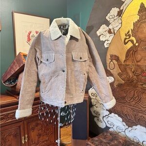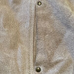 Stylish tan jacket with cozy sherpa lining. Features button closure and front pockets. Couple little stains like on edges of front pockets and one by the button closure. hardly noticeable but I’ve pointed them out in pictures. Hasn’t been washed. Needs leather cleaning. Price reflects these tiny flaws. No rips or holes. Really cute and comfy. Lined with silky quilted lining. All buttons are there. Furry Sherpa accents are all clean and nice😌