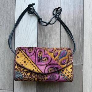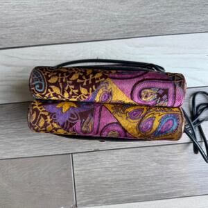 Rare vintage Harry Rosenfeld small purse featuring a bold mod paisley print in rich purple, mustard, burgundy, and teal tones. Crafted in soft brushed velvet with a structured silhouette and unique curved flap design. Finished with a red button accent, magnetic snap closure, and slim black shoulder strap.