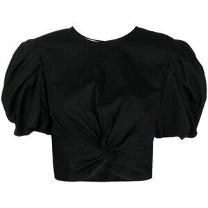 A twist of fabric cut from organic cotton forms a sophisticated blouse with sumptuous puff sleeves.