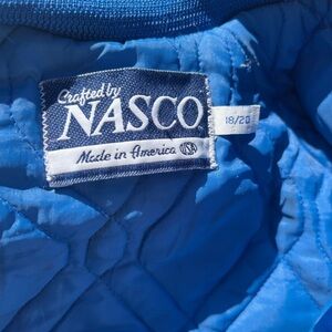 Men's Vintage NASCO Jacket Blue Christian Academy L Lined 80s Snap Bomber Vinyl. Poly blend. Snap button. Made in USA.
