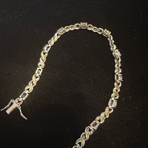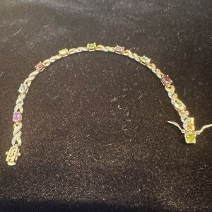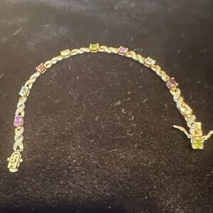 Elevate your style with this stunning sterling silver bracelet, featuring a vibrant array of garnet, peridot, amethyst, blue topaz, and citrine stones. The 8-inch chain, adorned with 18k gold vermeil, offers a luxurious touch, making it perfect for both everyday wear and special occasions. Whether you're attending a formal event or enjoying a casual outing, this bracelet adds a splash of color and elegance to any ensemble. Pre-owned and marked China 925, it retains its charm.