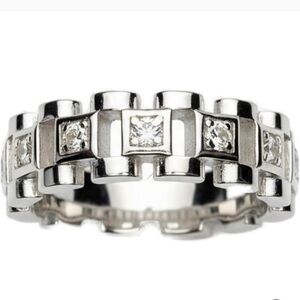 Stunning moissanite link band, often referred to as a "Presidential" or watchband-style, characterized by a series of interconnected metal links mimicking the look of a luxury watch strap embellished with 9 small moissanite solitaires about 2/3 of the way around the ring.