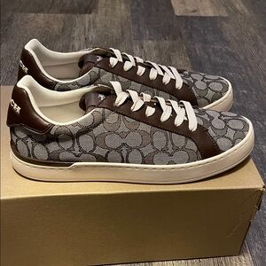 Elegant Coach sneakers with a chocolate and charcoal pattern. Accented with white laces and trim.