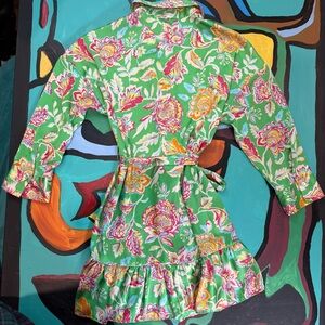 Bright green button down satin dress with bold floral patterns. Features pink and yellow highlights. Stylish and vibrant. Feels brand new. Super soft. Adjustable belt. See approximate measurements in photos.