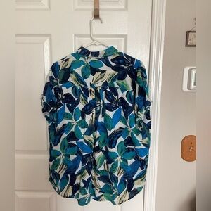 Perfect for the summer. This flowery top in blues, black, yellow on an ivory color.