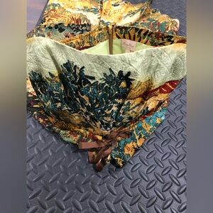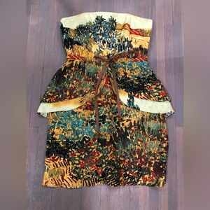 Tracy Reese launched her eponymous fashion line in 1998, becoming known for feminine silhouettes and vibrant prints. This particular corset-style dress featuring two structured, wire-like boning lines running vertically along the front for shape and definition, features a print inspired by Vincent van Gogh's post-impressionist artwork, showcasing the designer's artistic approach to fashion. The dress appeals to art enthusiasts and fashion-forward consumers who appreciate the intersection of fine art and wearable design. Tracy Reese pieces are valued for their quality construction and distinctive aesthetic that blends sophistication with playful elements.