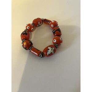 Celebrate spooky season in style with this handcrafted Halloween bracelet featuring vibrant orange lampwork glass beads. Each bead is individually hand-painted with festive Halloween designs — including ghosts, black cats, pumpkins, bats, eyeballs, and "BOO" lettering. The beads are accented with decorative silver spacers and strung on a stretch cord for an easy, comfortable fit.