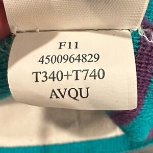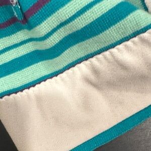 Stylish beanie with teal and purple stripes. Ideal for outdoor adventures. Soft and comfortable.