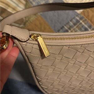 Chic Kate Spade shoulder bag with woven texture. Stylish and versatile for any outfit. Color is cozy gray.
