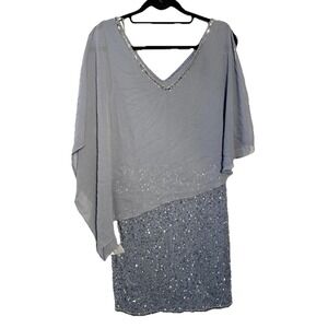 The J Kara Dress Caplet is a stunning cocktail dress in a size 8 with a v-neckline and short flutter sleeves. The dress is adorned with beaded accents and features a zipper closure for easy wear. The dusty blue color adds a touch of elegance, making it perfect for a party or special occasion during the summer, fall, or spring seasons. Made in India by the brand JKara, this sheath-style dress is sure to make a statement and turn heads wherever you go.