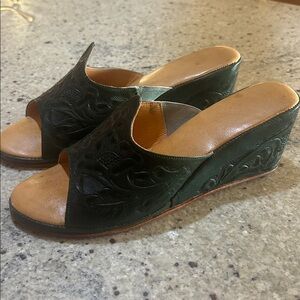 Beautiful forest green leather wedge slide sandals with embossed detailing. Features a cushioned tan footbed and comfortable wedge heel for easy all-day wear.