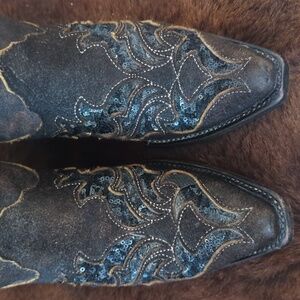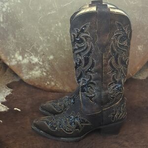 CORRAL handmade cowgirl western boots, style #R1152. Dark brown distressed roughout leather with laser cut floral & scroll design with black sequin underlay. Silver stitching around designs. Snip toe, 2" riding style heel, leather lining, leather sole, 12.25" tall shaft. Gypsy cowgirl, boho country vibe. Look great with dresses or jeans!