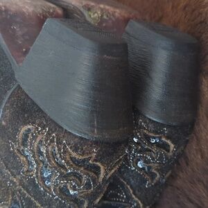 Excellent condition, worn only a few times. The toes do show some lightening/scuffing of leather but no scrapes. Light wear to sole/heel cap. No drag on heel caps. One small spot where sequins have come off, close to top of left boot , please see last 2 pics.