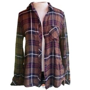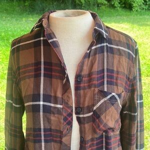 Beach lunch lounge plaid button down, brown blue white red, women’s size XS, in Excellent condition