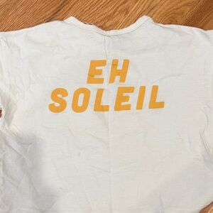 Brighten up your child's wardrobe with this white tee featuring a vibrant orange sun graphic. Perfect for everyday wear, this shirt offers both style and comfort. There are marks on the front of the shirt.