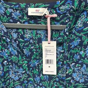 Vineyard Vines Women's Floral Pleated Top, Size M, a vibrant addition to any wardrobe. This top features a rich blue background with intricate green and blue floral patterns, embodying a fresh, summery aesthetic. The pleated detail at the front adds a touch of sophistication, while the long sleeves make it versatile for various seasons. Perfect for casual outings or dressing up for a relaxed event. Made from comfortable, breathable fabric. Retails for $148.00.