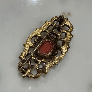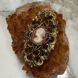 Charming vintage brooch with intricate gold detailing. Features a classic red cameo centerpiece. Ideal for adding a touch of sophistication.