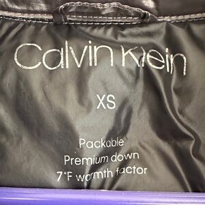 Chic Calvin Klein puffer with a metallic sheen. Lightweight and warm. Ideal for winter outings. Some wear on front and a sewn rip at bottom of sleeve