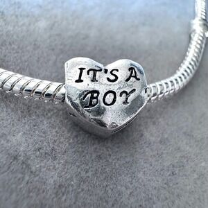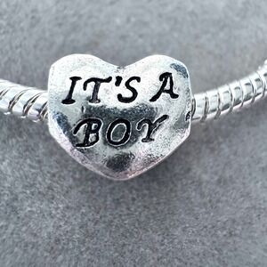 Heart-shaped silver charm features a stamped "IT'S A BOY" message in a classic serif font with dark oxidized detailing for high contrast. Crafted with a polished finish, this slide-on bead is designed to fit most standard snake chain bracelets, making it a perfect commemorative piece for a new arrival or baby shower gift. The double-sided design ensures the sentiment is visible from any angle.