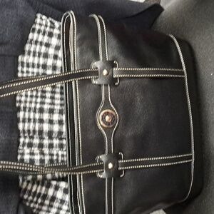i am including the small wallet and the key chain. This purse is in great condition..no smelly odors and clean red beautiful lining.Color: Black with elegant white contrast stitching.