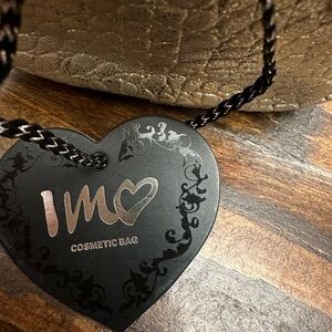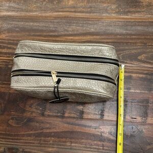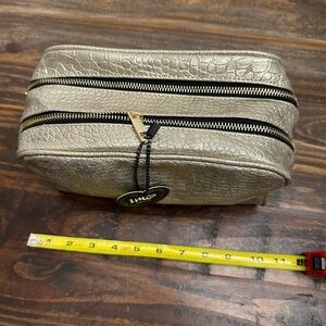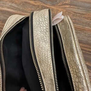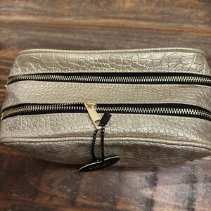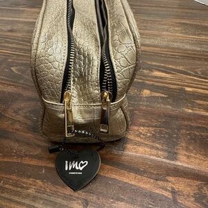 Keywords: cosmetic bag, makeup bag, travel case, gold bag, croc embossed, zip top, new with tags, IMO, makeup organizer, toiletry bag, metallic bag, faux leather bag