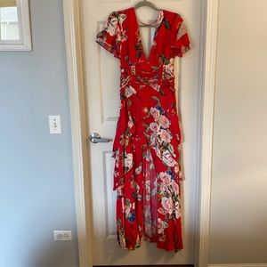 This stunning red maxi dress features a vibrant floral pattern, perfect for any occasion. The elegant design and flowing fabric offer both comfort and style.