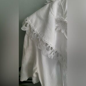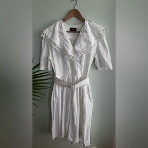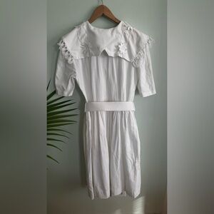 The dress isn’t as bright white as in the photo. It’s a vintage piece, and for a vintage item, the condition is very good, although a few threads are sticking out on the collar. The size tag has been removed, but the waist tag shows size 9, which is equivalent to a modern 8–10.