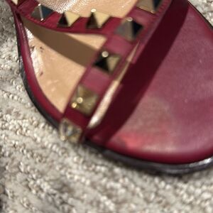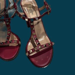 Fabulous pair of dark red Valentino Garavani Rockstud sandals in the color Rubino. They are are approximately 4” high. Block heel makes them comfortable and easy to walk in! Box, dust bag and copy of the receipt are included. They are in excellent used condition. Pictures of every small flaws. I’m very picky! You won’t be disappointed!