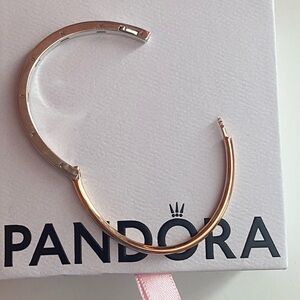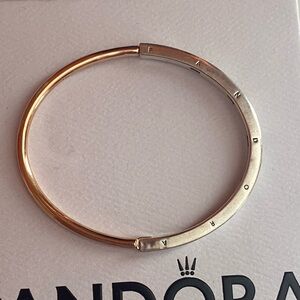 Make minimal stacking your mantra with the Pandora Signature Two-tone I-D Pavé Bangle. The minimalist bracelet is crafted from two metal finishes; sterling silver and a 14k rose gold-plated unique metal blend. The band's profile transitions from square to round; the squared half features evenly spaced sparkling baguette stones, while the rounded part is warm-toned. The engraved logo on the side corresponds with the placement of the baguette stones. The unique hinge and click closure clasp make it easy to wear and remove this Pandora bangle bracelet. Wear alone as your signature piece, or stack multiple bracelets for a bold look.