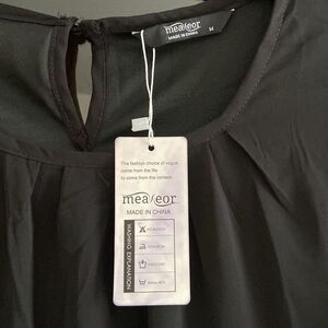 Meaneor Black Lightweight Long Sheer Sleeve Blouse new with tag. Size: medium. Lined bodice. Sheer sleeves. Back button and loop closure. No stretch. Measurements approximately while laying flat: Length: 28”. Sleeve: 23”. Armpit to armpit: 19”. Fabric: 85% polyester, 10% cotton, 5% spandex. Smoke free and pet free home.